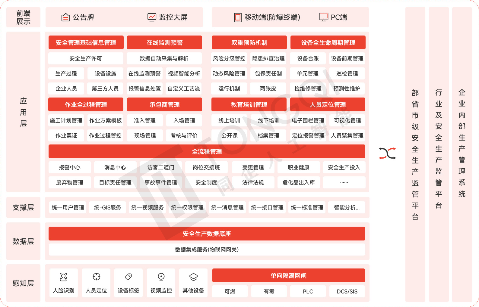 自主研发,可定制。适用化工、冶金、能源、港口、工贸、机械等行业,包含双重预防、作业全过程、在线监测预警、人员定位、AI视频预警、教育培训、设备全生命周期等40多项功能。平台赋能安全生产的感知、监测、预警、处置和评估能力,加速安全生产从静态分析向动态感知、事后应急向事前预防、单点防控向全局联防的转变,全面提升企业生产风险隐患管控水平,显著降低事故概率。